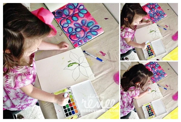 I LOVE these paints, so I quickly cleaned up and we played out in the living room. Good thing she wasn't too upset. And, good thing there's materials for her 4-year-old self and there's materials for my mama-self, tucked away in safe keeping and that ONLY come out when I get some alone time. ;)